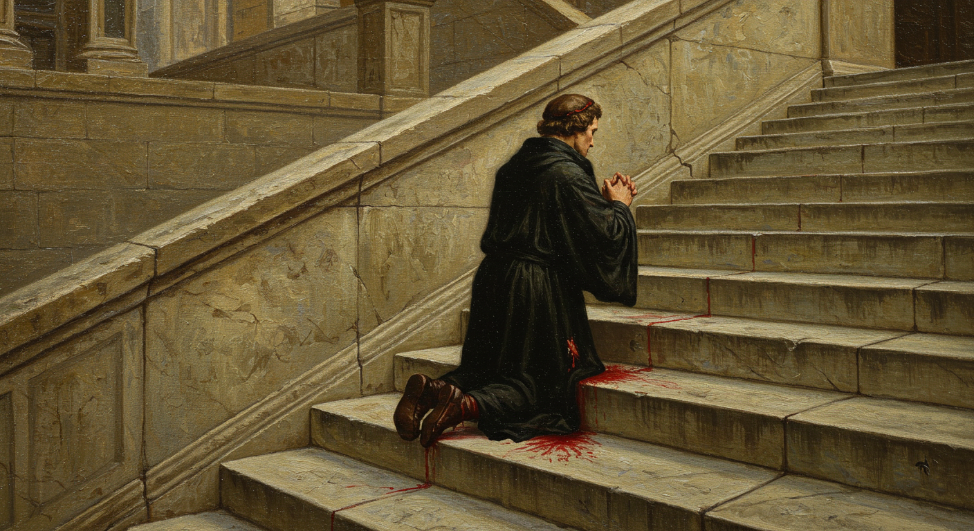 사람의 행위와 하나님의 은혜가 결합해 구원을 이룬다는 가르침, 죄를 지은자는 회개와 속죄의 표시로 육체적 고통을 감뇌하는 고행을 해야 한다는 가르침, 그래서 실제로 어떤 수도승들은 유혹을 이기거나 죄책감에서 벗어나기 위해 가시밭에 뒹굴기도 했고 종교개혁가 루터도 비아 돌로로사라 불리는 예수님이 십자가를 지고 골고다 언덕까지 걸어간 길인 돌계단을 무릎으로 기어오르며 기도하기도 했었습니다.