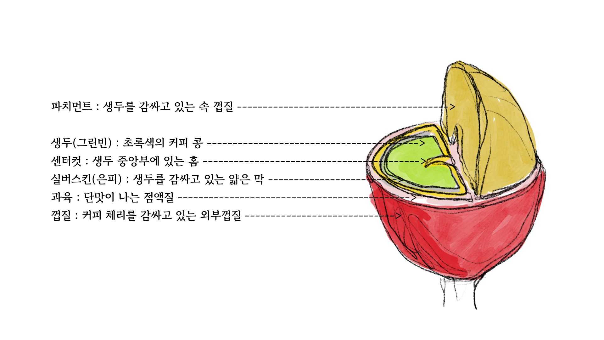 커피체리를 따서 그 안의 구조를 살펴보면 아래와 같다.