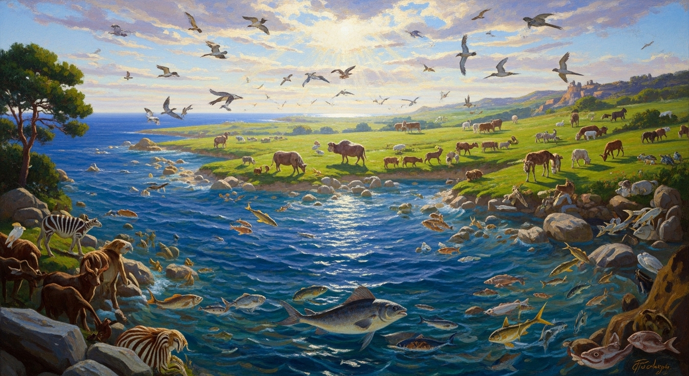 그리고 다섯째 날에 바닷속에 해양 동물들을 만드셨습니다. 그리고 하늘에도 땅에 기초를 두었지만 하늘을 날아다니는 각종 날개 있는 동물들을 만드셨습니다.