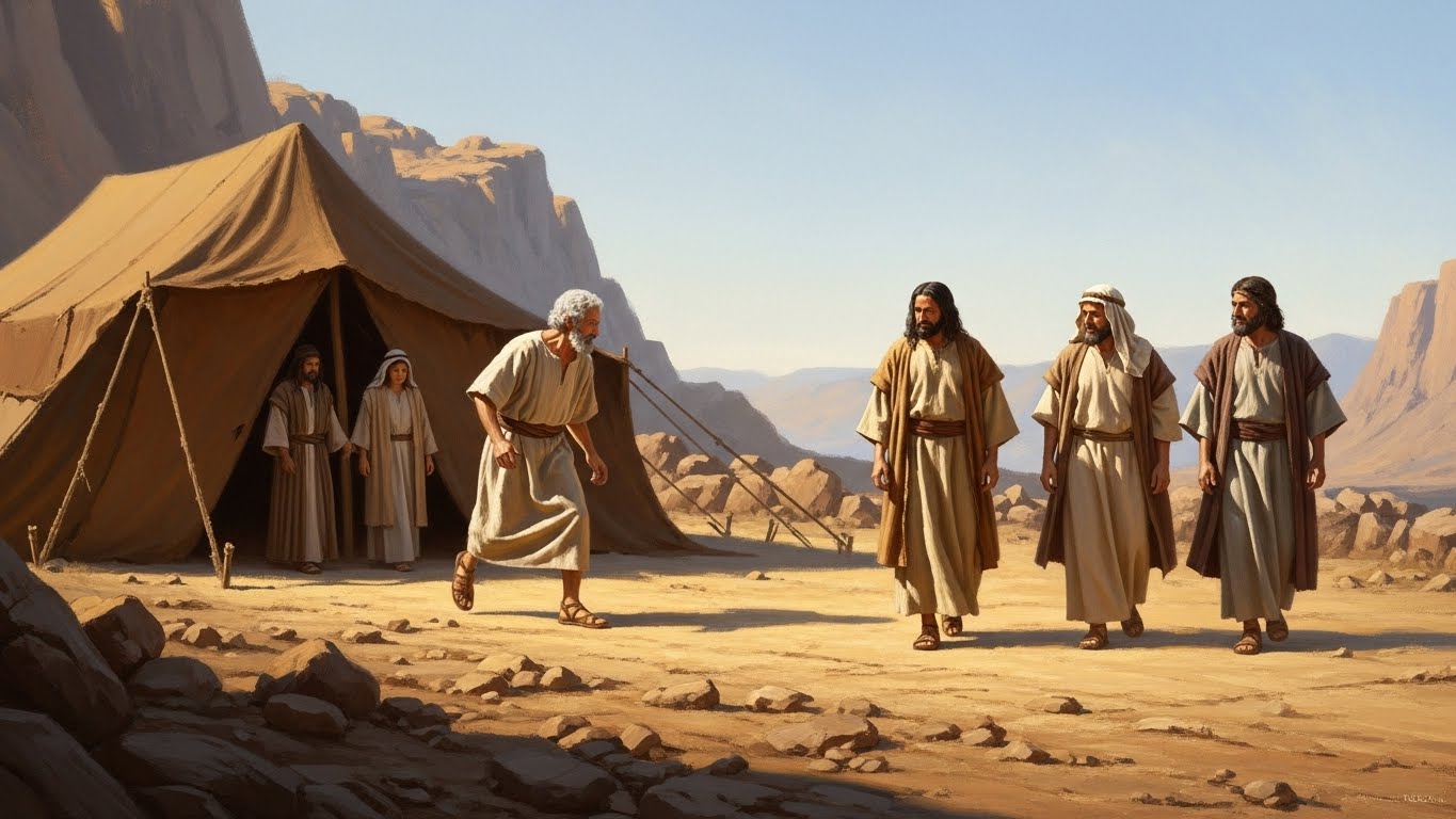 하나님께서 세 사람의 모습으로 아브라함을 찾아오셨습니다. 아브라함은 대낮에 장막 문 앞에 앉아 있다가 그 세 사람을 보고는 집으로 영접합니다.