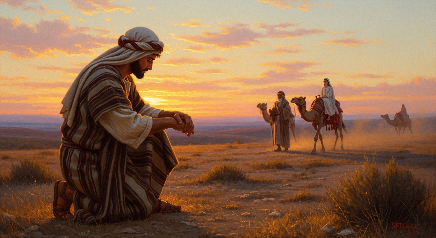 해가 저가며 세상이 붉게 물들어가는 오후의 한 때에 하나님께 낮은 목소리로 읊조리는 기도를 드리다 낙타 무리의 소리를 듣고 눈을 뜹니다. 이삭의 눈앞에 흙먼지를 일으키며 아브라함의 충실한 종과 낙타무리를 봅니다. 그런데 낯선 한 여성도 함께 하고 있음을 보게 됩니다.