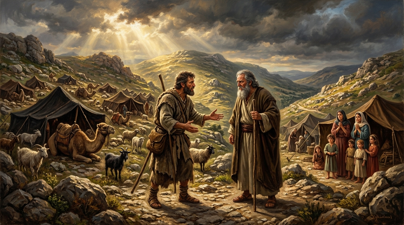 야곱은 아내들의 동의를 얻어 자식들과 아내들을 낙타에 태우고 모든 가축과 소유물을 가지고 밧단아람에서 가나안 땅으로 출발했습니다.
