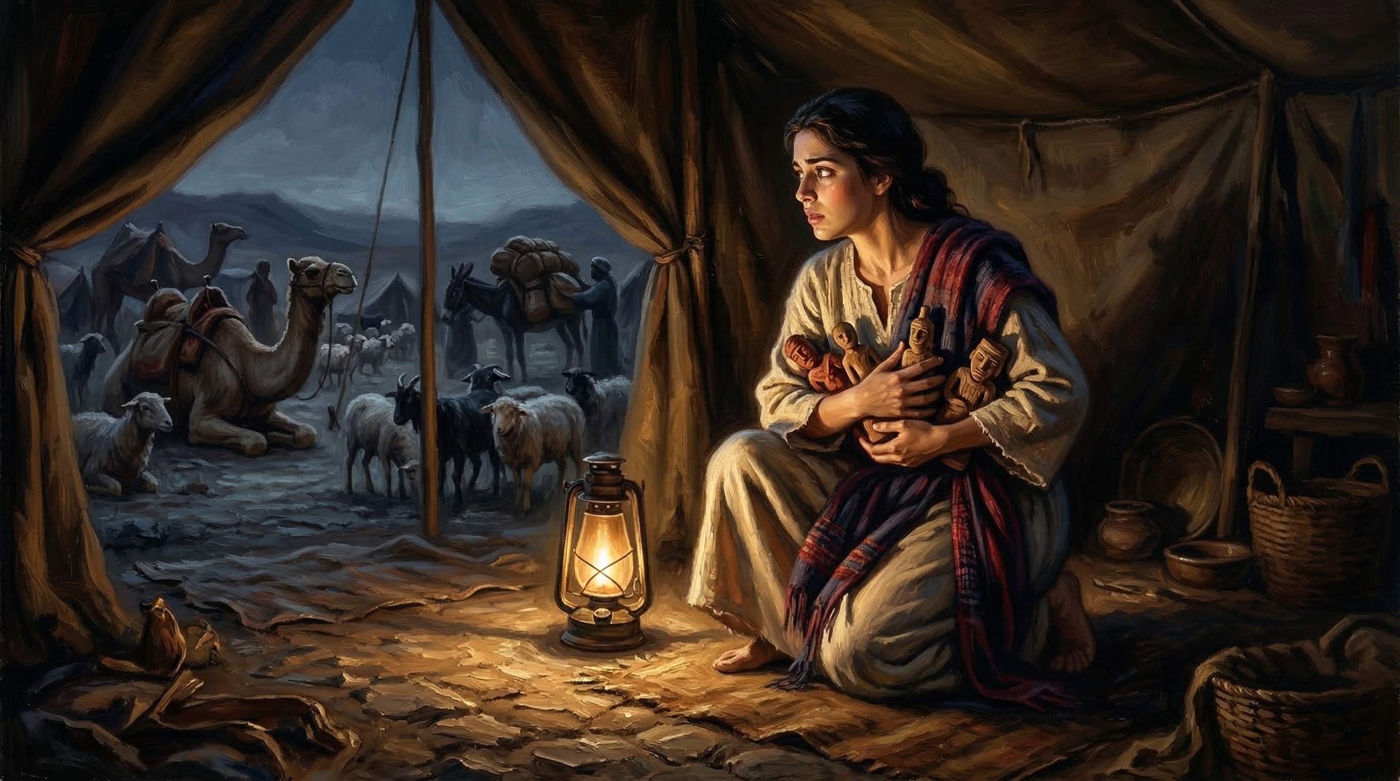 라헬은 아버지 라반이 양털을 깎으러 떠난 사이에 아버지의 드라빔을 훔칩니다.
