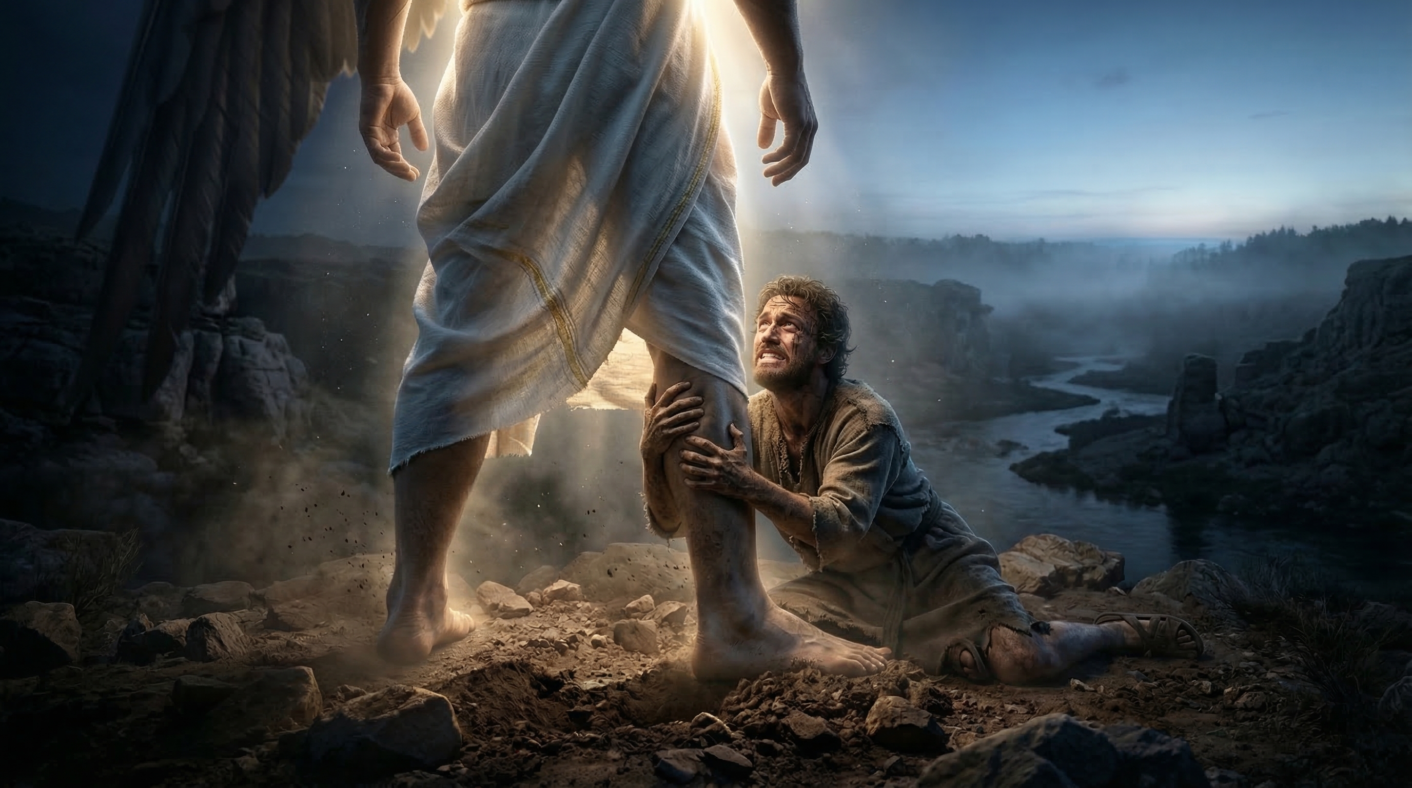 하나님은 야곱의 허벅지 관절을 치셨습니다. 야곱은 허벅지 관절이 어긋나버렸습니다. 그런데 야곱은 그럼에도 불구하고 놓지 않고 붙잡았습니다. 야곱은 그가 축복해주기를 바랐습니다.