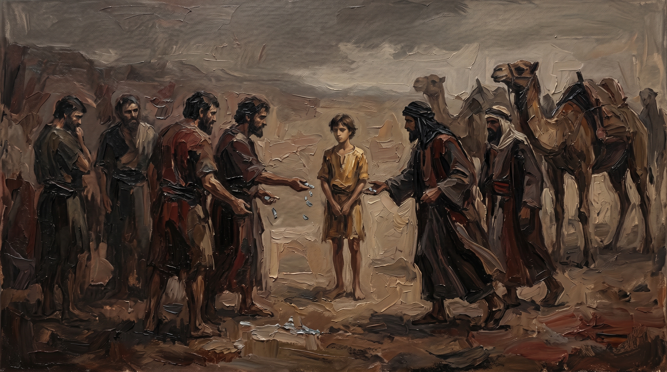 28 그 때에 미디안 사람 상인들이 지나가고 있는지라 형들이 요셉을 구덩이에서 끌어올리고 은 이십에 그를 이스마엘 사람들에게 팔매 그 상인들이 요셉을 데리고 애굽으로 갔더라