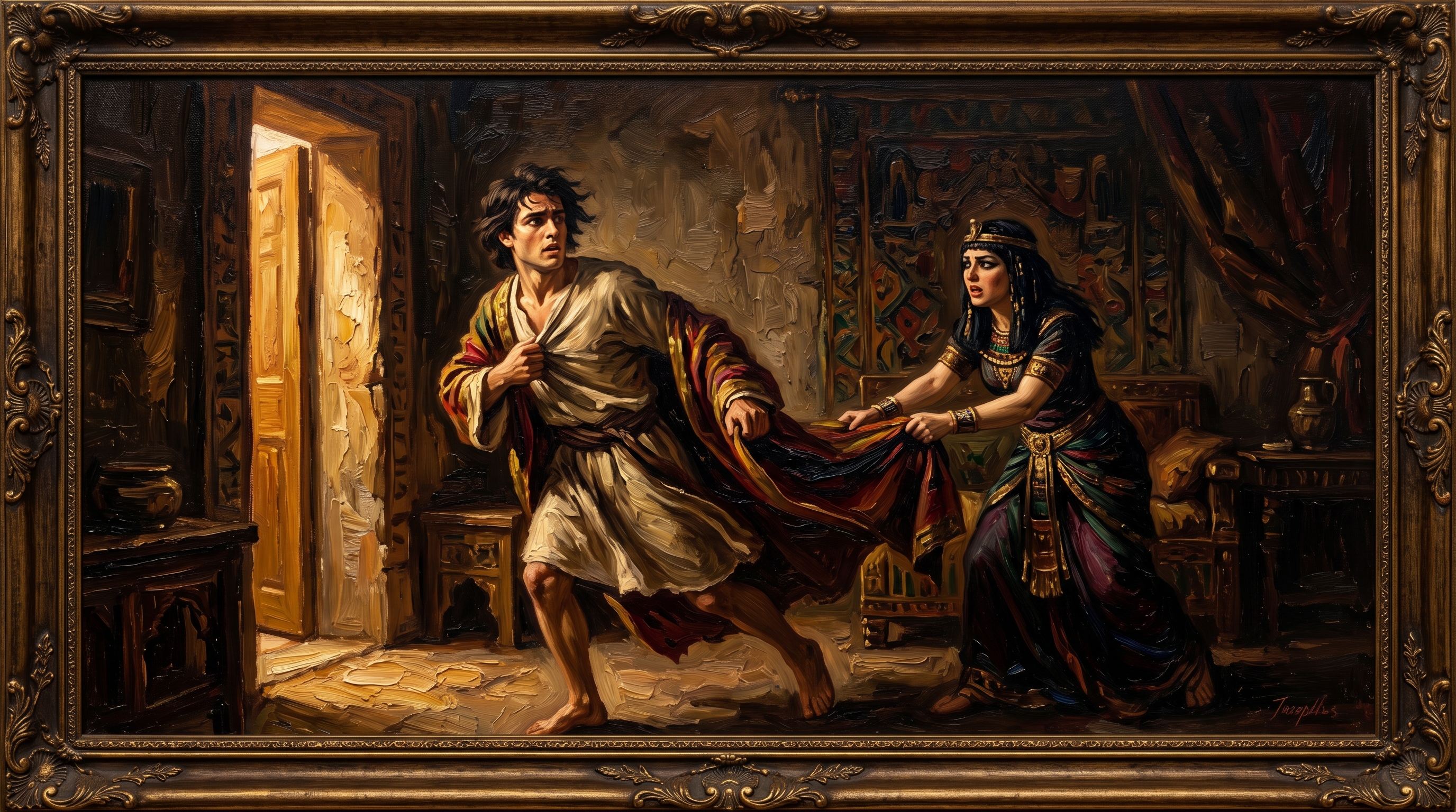 그러던 어느 날 보디발 장군의 아내는 요셉을 붙잡고 유혹했습니다. 요셉은 그 자리를 피하고자 그녀가 잡고 있는 옷을 벗어버리고 도망쳤습니다.