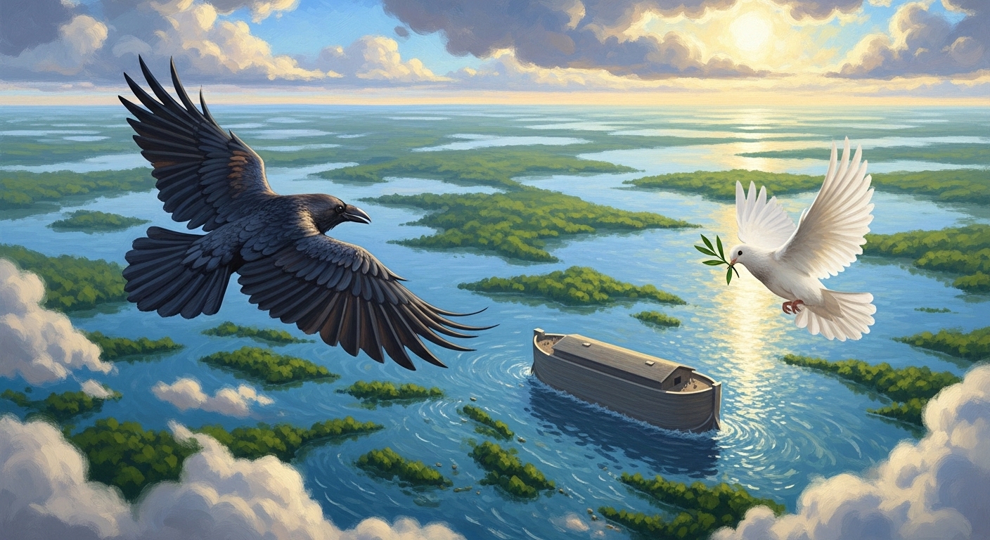 노아는 두 종류의 새를 순차적으로 날려 보냅니다. 까마귀와 비둘기입니다.