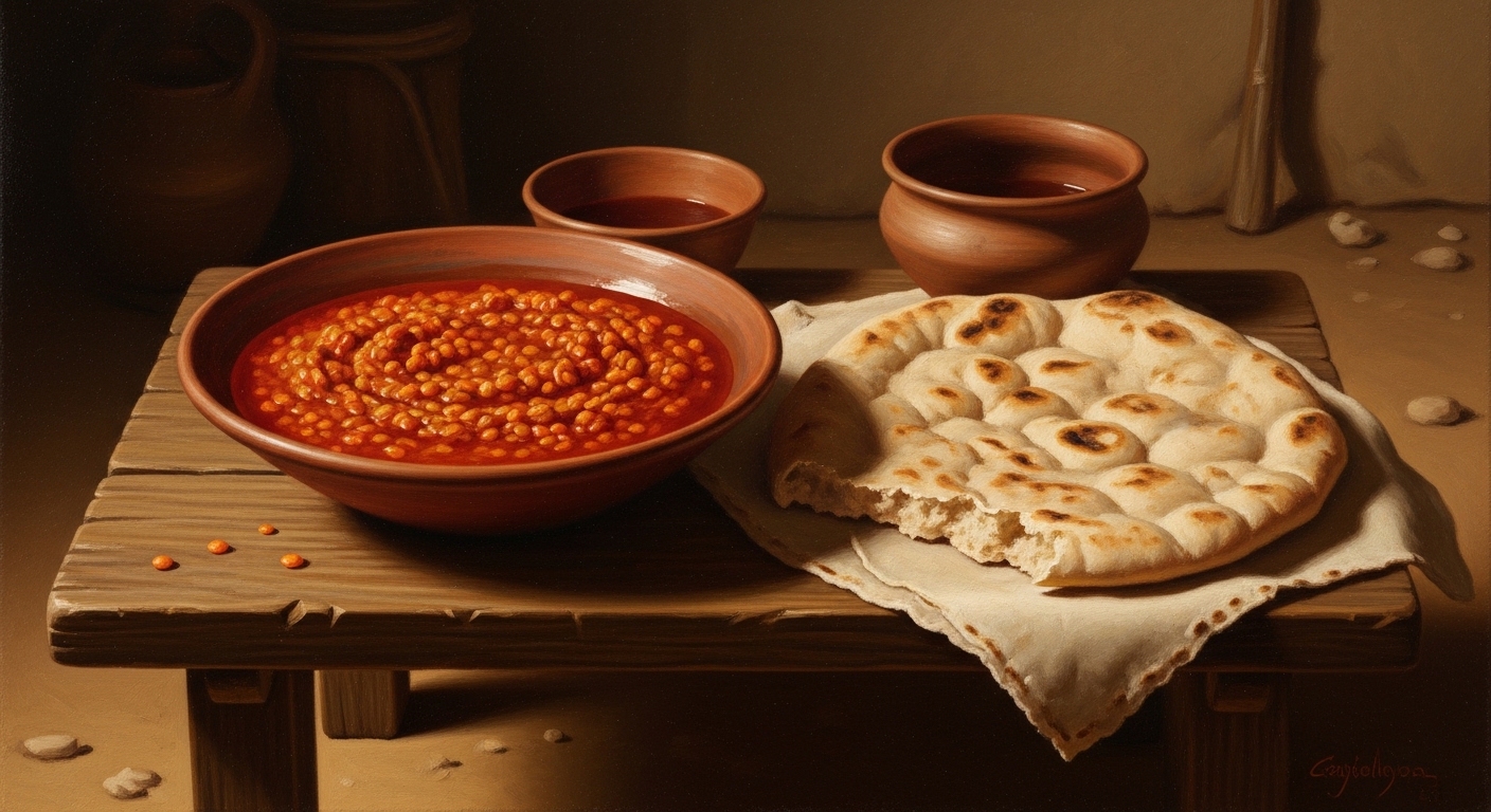 이상한 점이 있습니다. ‘팥죽’이라고 번역이 되어 있습니다. 그런데 원어는 이렇습니다. [עָדָשׁ(아다쉬)]로 렌즈콩 혹은 렌틸콩입니다. 이는 성경이 우리말로 번역될 때 우리나라의 문화적인 부분이 가미된 것이라 보입니다.